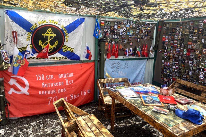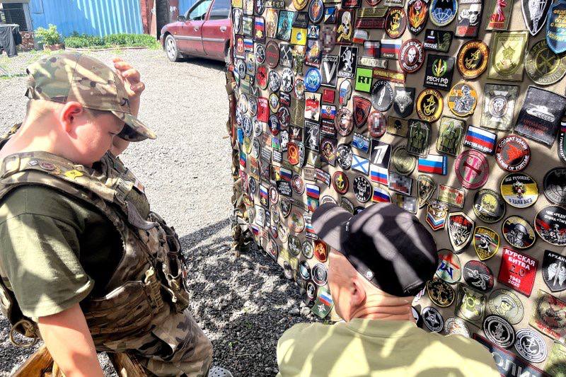 Во дворе беседка, куда бойцы заходят без стука, как домой: передохнуть, перекурить, оставить на память шеврон. Стены усеяны нашивками на липучках: «Отвага. Честь. Долг», «Курская битва 2.0», «Не зли русских». Их оставили парни от Калининграда до Владивостока, и каждый - чья-то судьба, чье-то «спасибо» мальчишке, который все эти месяцы ждал их на этой дороге.